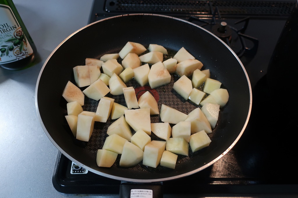 ジャガイモを炒めます。切ってから時間が経ってしまいちょっと黒くなってしまいました。ジャガイモは切ったらすぐに火を通した方がよいです。