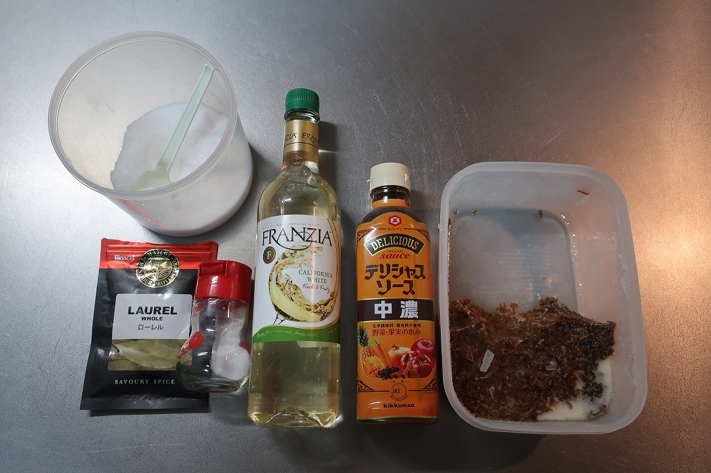 調味のために追加したもの。塩、ローレル、味の素、白ワイン、ソース、冷凍飴玉ニンニク。