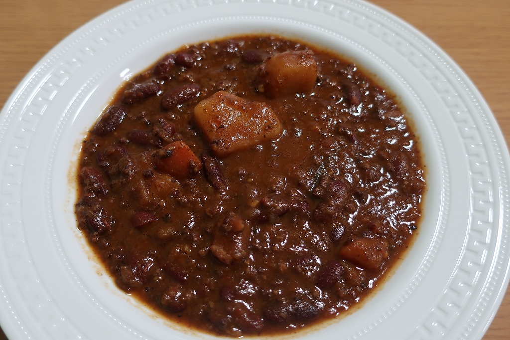 普通ジャガイモと人参はチリコンカンに入れませんが、入れた方が味がしっくりきます。日本式カレーの組み合わせは偉大です。