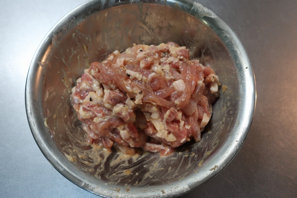 豚肉の下ごしらえをします。細切りにして、醤油、酒、ニンニク、ショウガで下味をつけた後に小麦粉で和えます。10分程おき味を染み込ませます。