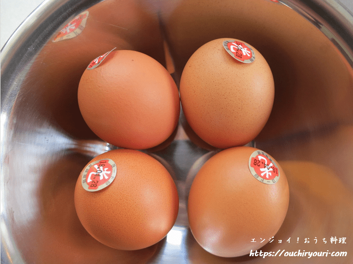 卵はヨード卵がお気に入りです。高いけど美味しい。これを茹で卵にします。