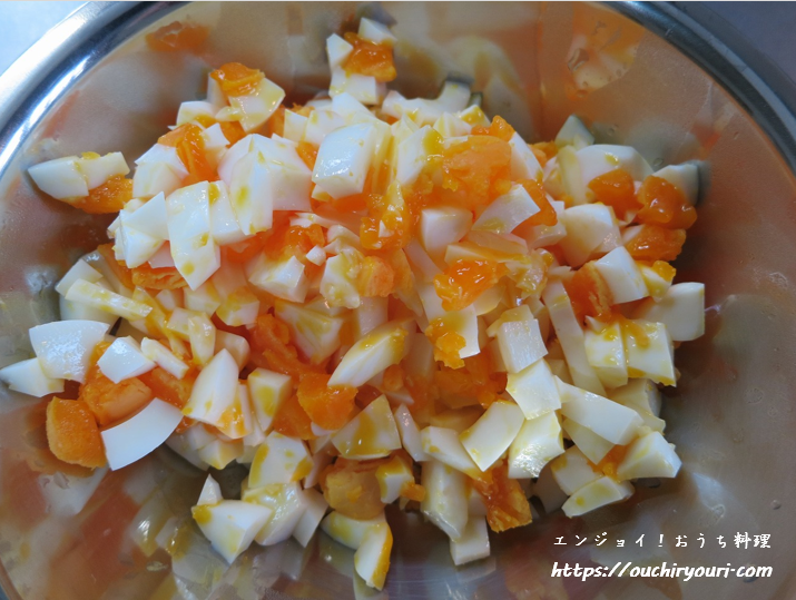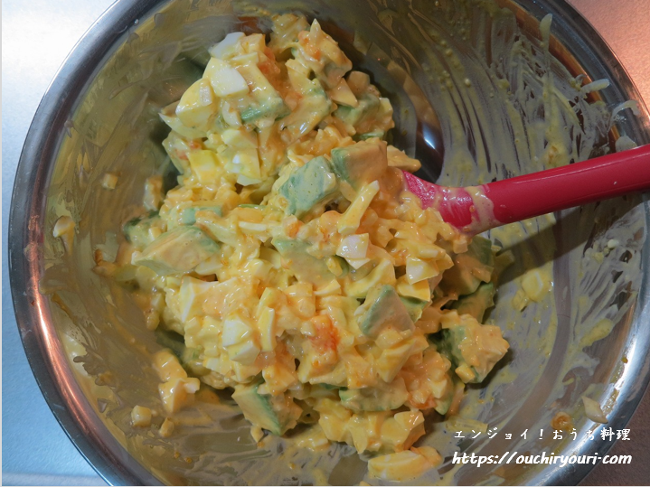茹で卵、玉ねぎ、アボガドを混ぜ、マヨネーズ、レモン汁で調味します。