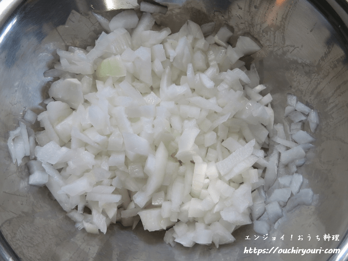 新玉ねぎも粗みじんにします。この後塩もみして水分を切ったのですが、余計な操作でした。余計な手を加えずフレッシュ感を残した方が良かったです。
