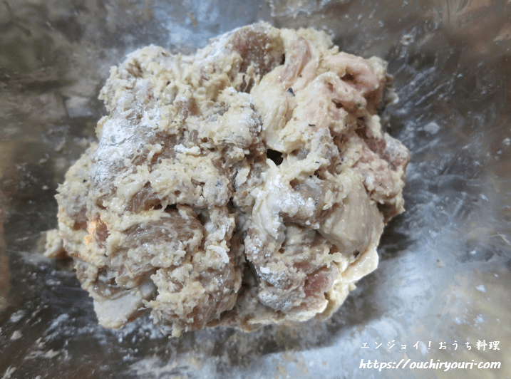 豚肩ロースを切って、醤油、酒、生姜、ニンニクに数日間漬けこみました。生姜、ニンニクを手ですりおろすのは結構だるいので、バーミックスで粉砕しました。このタレは鶏のから揚げにも使えます。タレごと小麦粉でまとめます。タレごとまとめることで味のある唐揚げになります。