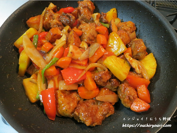 最後のタレは最初から水を加えて、片栗粉でとろみをつけておき、そこに具材投入のスタイルの方がいいかも。その場合はパインも予備炒めをする。