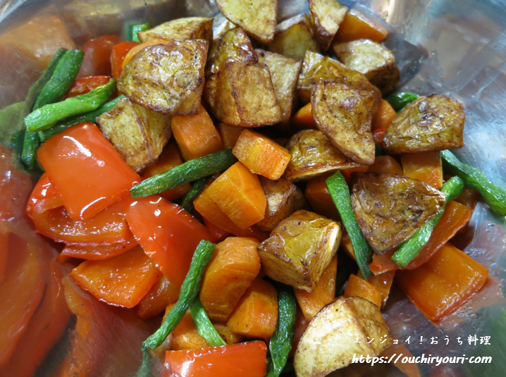 その他野菜を油通しします。今回はサヤインゲン、人参、パプリカを油通ししました。今日はどういうわけか油が物凄く泡立ちました。油の粘性が高く、気泡が逃げにくいようです。油が重合しているようです。こうなったら油を交換しましょう。