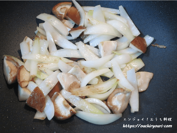 油通ししない野菜類は予備炒めをします。キノコは大量に油を吸いそうなので炒めにしました。玉ねぎはシャッキリ感を残したかったので。