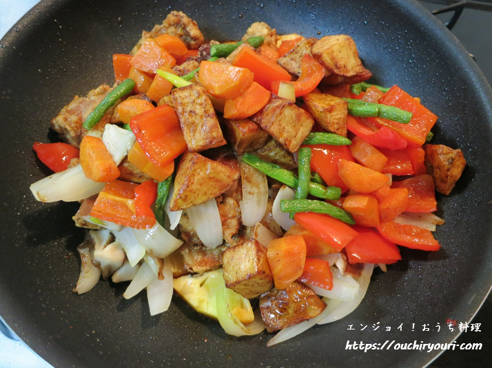 具を投入しタレにからめます。タレのボリュームが少なく、からみが悪かったので水を少し注ぎ、煮るように炒めました。