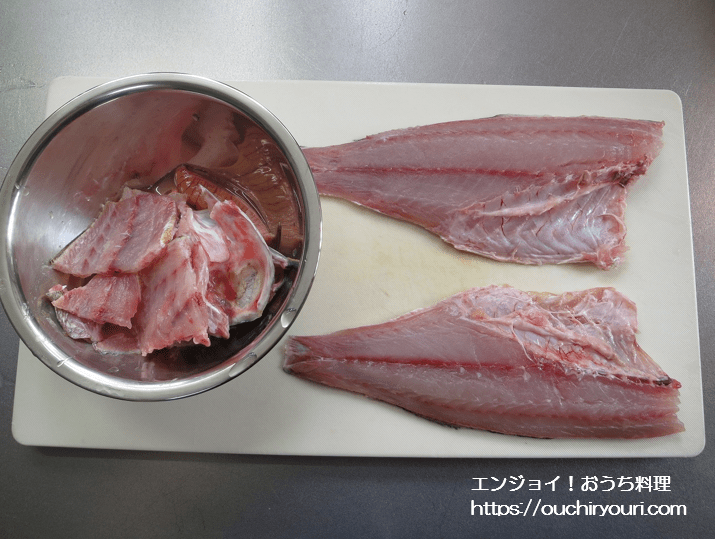 今回は腹骨の部分は落とさず、焼いてから骨を抜くことにしました。魚は火を通すと骨離れがよくなります。