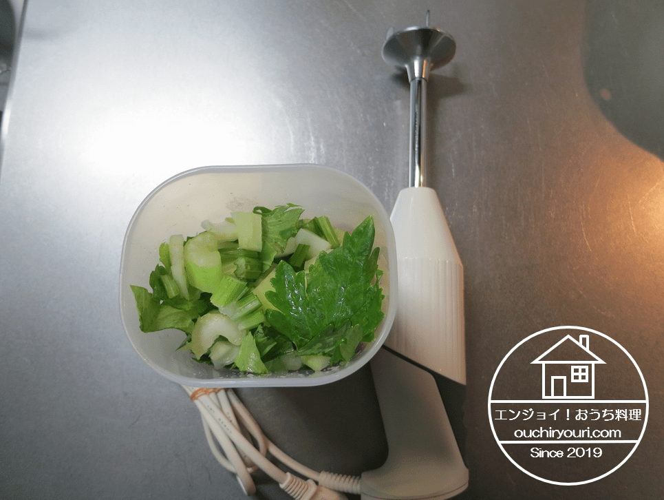 ホールトマト缶とセロリをバーミックスで粉砕します。