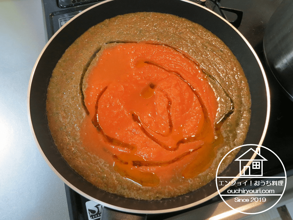 粉砕した野菜にオリーブ油を加えて煮詰めましたが、これは間違いでした。粉砕して泥状になったものを煮詰めるのは危険です。沸騰するマグマのようになって飛び散るからです。細かく切って炒めてから粉砕するのが正解です。今回は蓋をして何とかやりすごしました。蓋は飛沫でビチャビチャになりました。