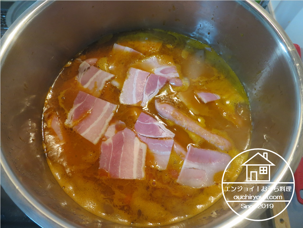 ウィンナーとベーコンを投入します。炒めて香ばしさを付与してから投入した方が良かったかもしれません。