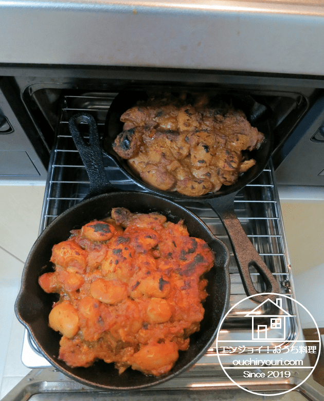 汁気がなくなったらスキレットに盛って魚焼きグリルで焼いて焼き目をつけました。フランス料理ではこのように煮物に焼き目をつけた料理のことをキャセロールと言うそうです。