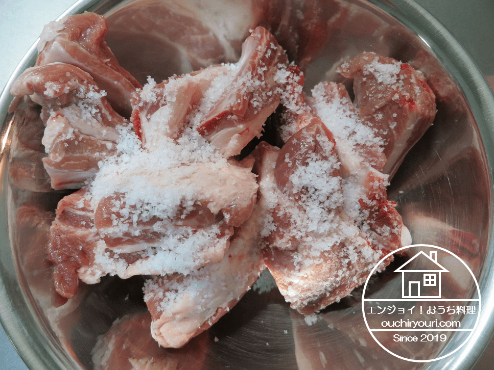 豚のスペアリブに塩を振って1晩おき、塩豚を作ります。塩豚にする必要があるのかは疑問ですが、ありったけの保存食を煮込んだことが発祥なのでそれを踏襲します。