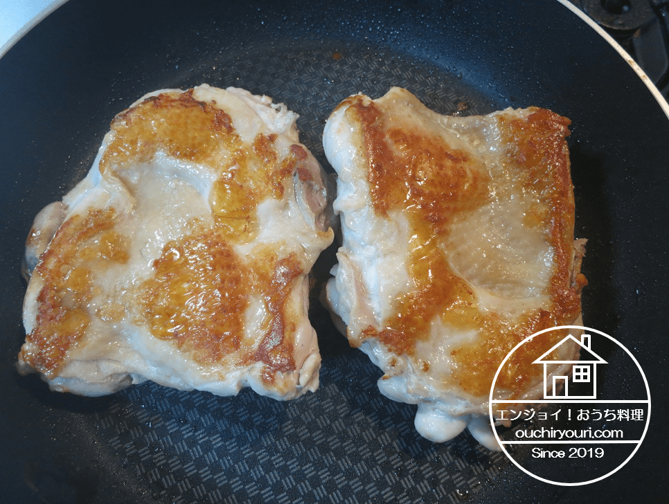 鶏モモ肉をソテーします。焼けたら大振りに切ります。