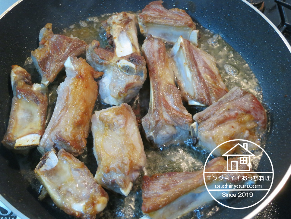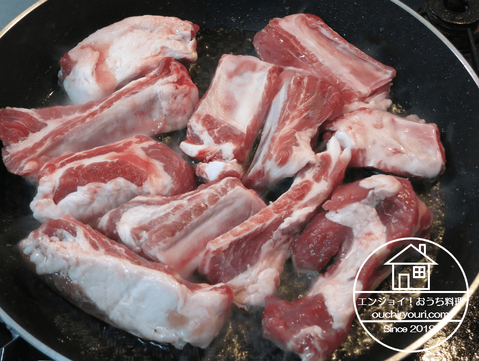塩豚を焼きます。スペアリブはコロコロしていて、フライパンの平面には接触しにくいです。なので油を多めに入れ、油を熱媒として焼きます。