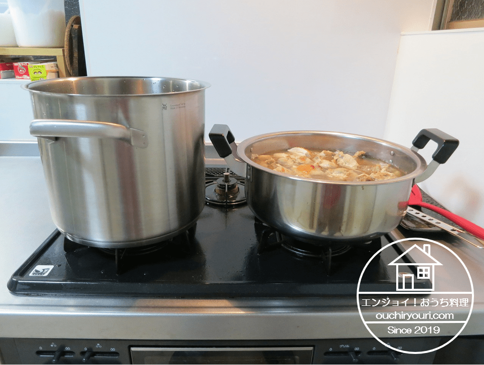 丸1日で豆が戻りました。水からゆで、3回ゆでこぼし(沸騰したら湯を捨てること。あく抜きの手法)ました。袋にそう書いてあったので。