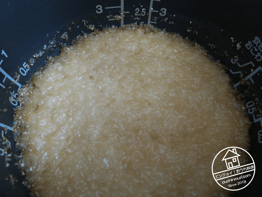 18時間後の様子です。水が蒸発して体積が減りました。茶色いのはご飯に発芽玄米が入っているからです。