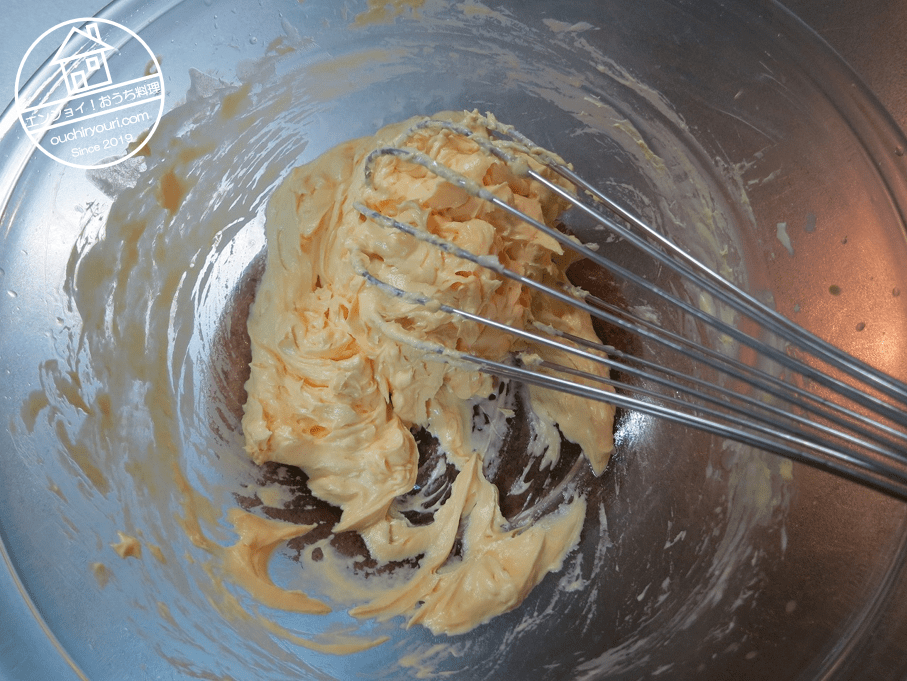 卵2個を解きほぐし、少しづつバターに合わせます。