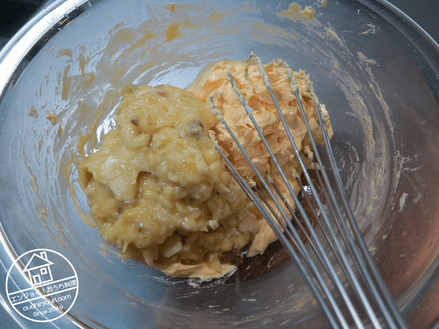 材料:バター100g、卵2個、ホットケーキミックス150g、バナナ2本