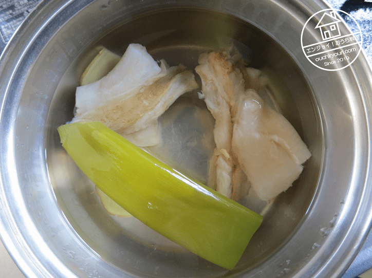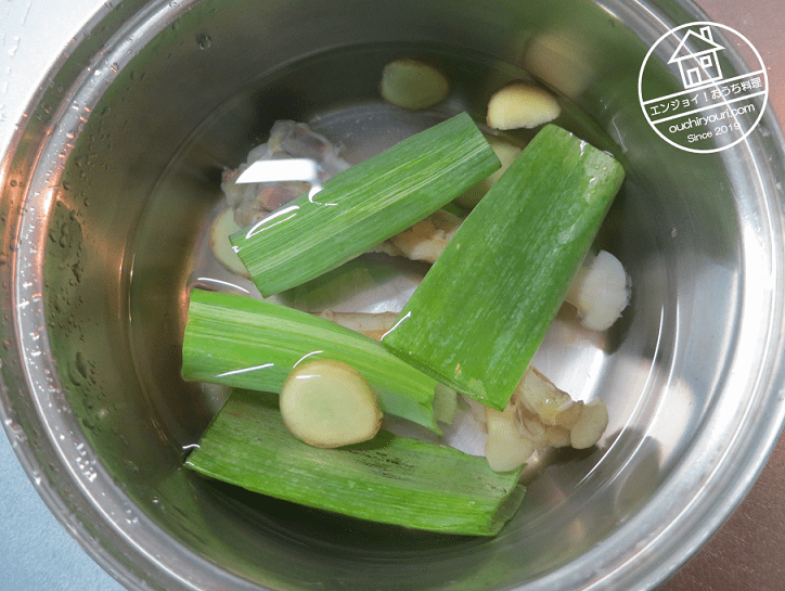 水を入れ替え、生姜、ネギ、日本酒を加え、30分煮ます。