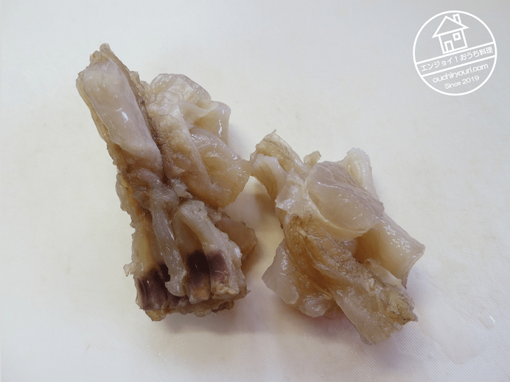 皮と軟骨を除去し、可食部を取り出しました。ブルンブルンで、これ以上の戻しは必要ない気がしますが、漫画の内容に従いもう少し戻し作業をします。