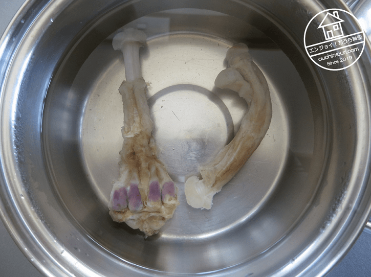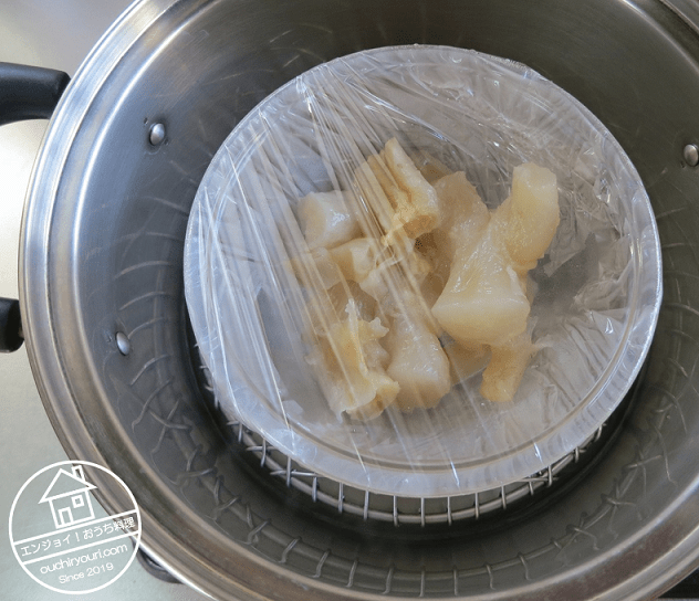 8時間蒸します。最初はラップをしていましたが、コラーゲンを膨潤させるには水が必要ですし、ラップをしない方が臭みが抜けると思ったので、ラップは外しました。
