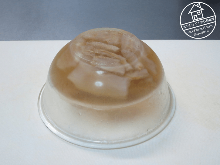 8時間蒸して冷蔵庫で冷やした後の状態です。蒸したときに水滴が入ってスープ状になりました。また8時間蒸したことで鹿筋は更に軟らかくなり、トロトロになりました。ここまで軟らかくする必要はなかったように感じます。