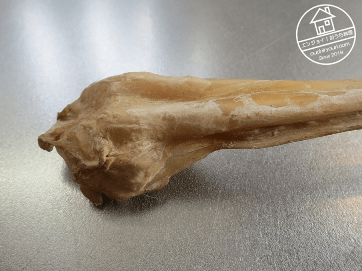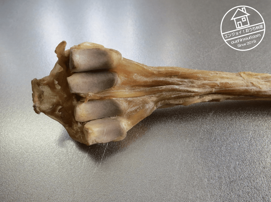 小鍋に収まるよう、出刃包丁で半分に切りました。密度の高いコラーゲン繊維なので頑丈で粘りがあり、簡単には切れなかったです。