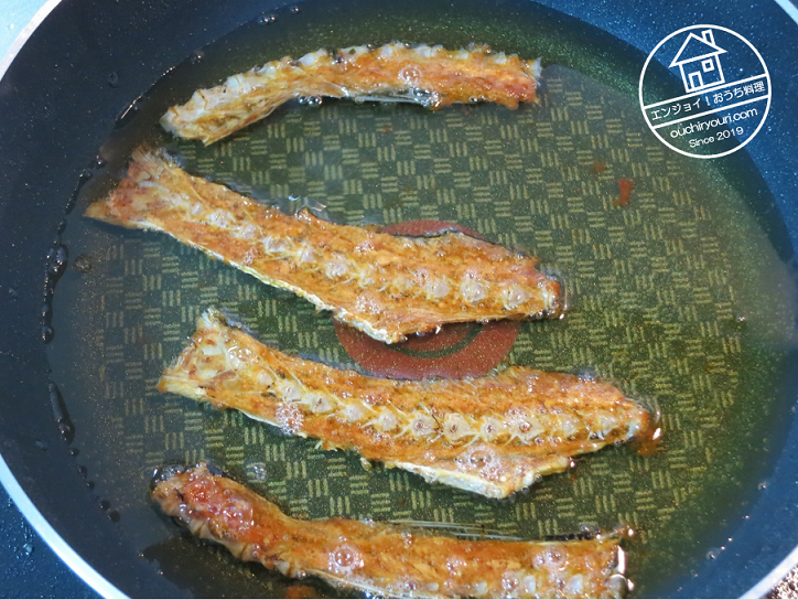 骨煎餅は魚の骨を低温でじっくり揚げて作ります。温度が100℃を超え、泡がブクブク出てればOK。それ以上に温度を上げる必要は基本的にはありません。魚の骨から水分を抜くことが大事です。水分が抜ければ骨はパリパリになって食べられます。