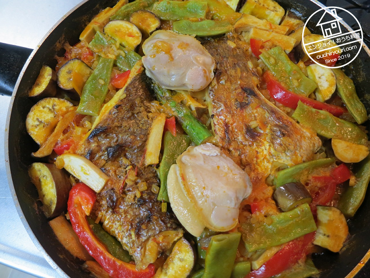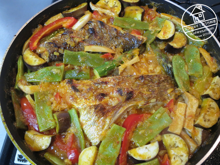 具を乗せます。塩焼きの鯛、アスパラガス、茄子、モロッコインゲン、エリンギ、パプリカを乗せました。夏野菜が合うように思います。