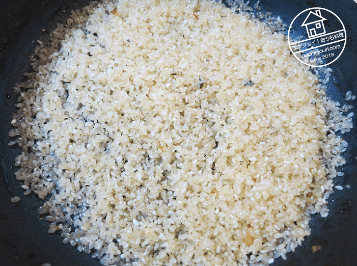 洗ってない生米をオリーブ油で炒めます。この工程を踏まないレシピもありますが、やった方が米が軟らかく炊きあがってより美味しい気がします。
