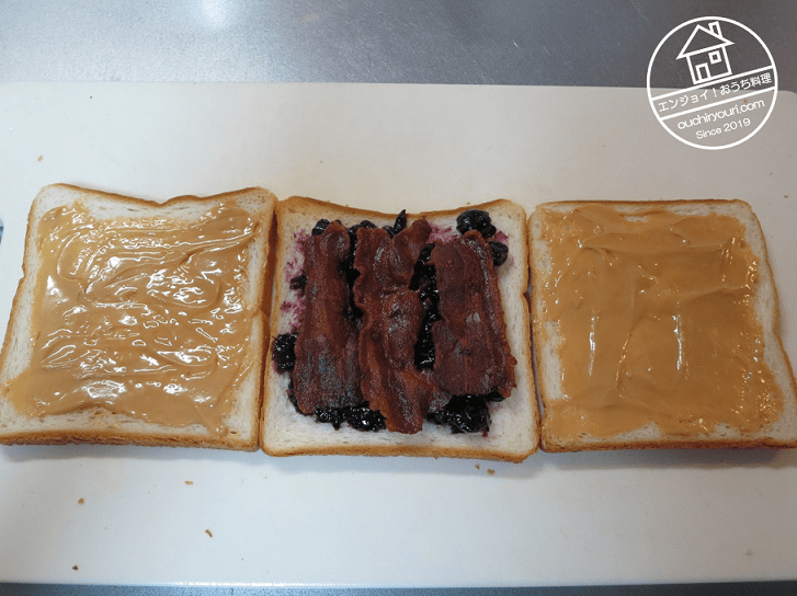 ベーコンのパン1枚と、ピーナッツバターを塗ったパン2枚とを重ねます。カロリーが凄そうです。