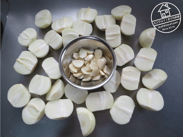 飴玉を使うときは必ずニンニクも使うので、僕は飴玉にニンニクを入れます。玉ねぎとニンニクの割合に厳密な決まりはありません。
