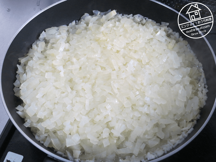 玉ねぎ7個半のみじん切りです。時短のため、耐熱ガラスボウルに入れて電子レンジで加熱します。600Wの5分×3回でしんなりして自身から出たスープでひたひたになりました。電子レンジも加熱ムラがあるので、5分おきにボウルを回転させました。