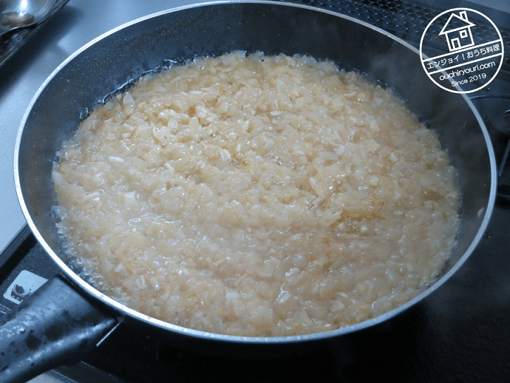 水を加えたら強火にして、水を飛ばします。水がなくなったら、また水を加えます。一見無駄な作業のようですが、これを繰り返すことで玉ねぎが溶け、全体が均一に茶色くなります。