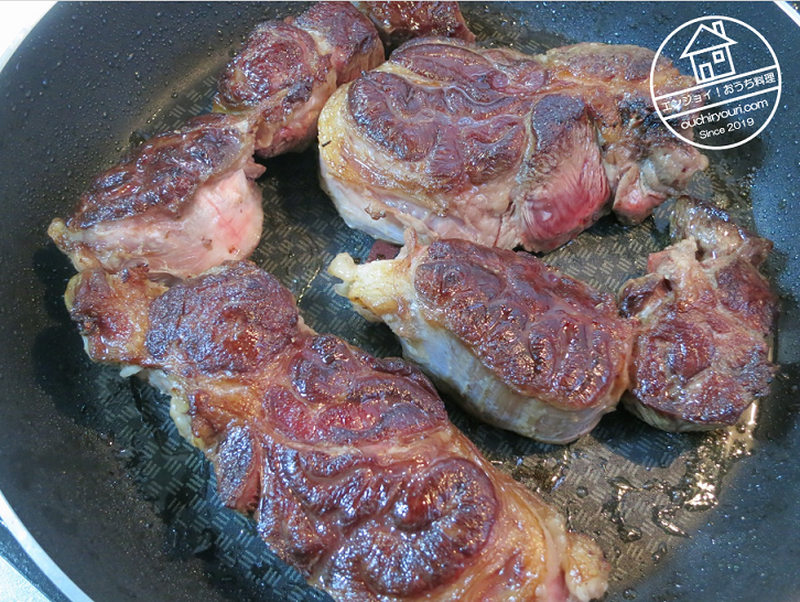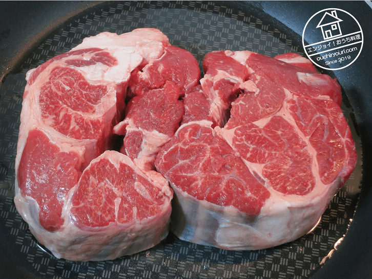 こちらは牛スネ肉1kgです。肉じゃがの起源はビーフシチューだそうですので、ビーフシチューに近い肉じゃがを作ることにしました。先ずはフライパンで肉に焼き目をつけます。