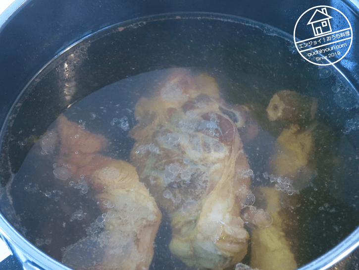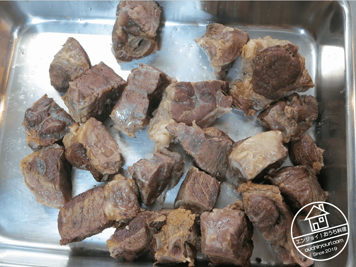 1時間水煮します。すね肉の食べごろは煮込みで2-3時間です。煮込みが足りないと固いですし、煮込み過ぎると崩れてしまいます。すね肉はそんなには長時間煮なくてよいんです。