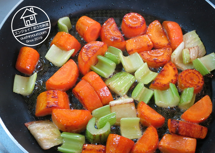 人参とセロリもコンガリと炒め、鍋に入れました。鍋がだんだんと強くなっていきます。