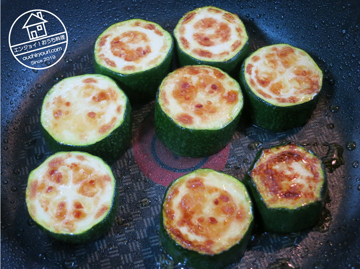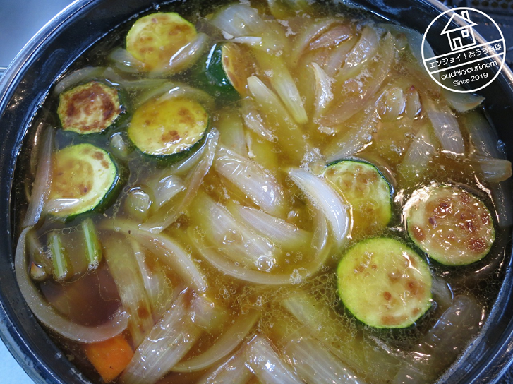 冷蔵庫にズッキーニがあったので、これもコンガリ炒めて鍋に入れました。
