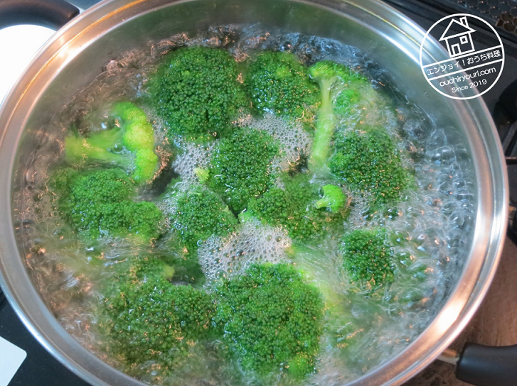 ブロッコリーを熱湯で4分茹でます。ブロッコリーの根本は固いですが、固いのは外皮だけで、一皮むけば美味しく食べられます。捨てずに利用しましょう。