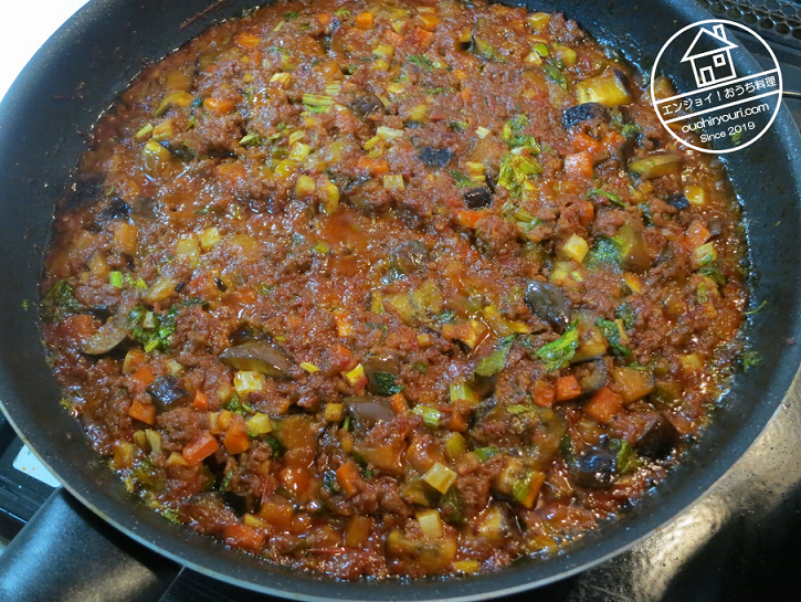合い挽き肉500gを加えて炒めます。更に人参1本、茄子3本、セロリ適量を加えました。
