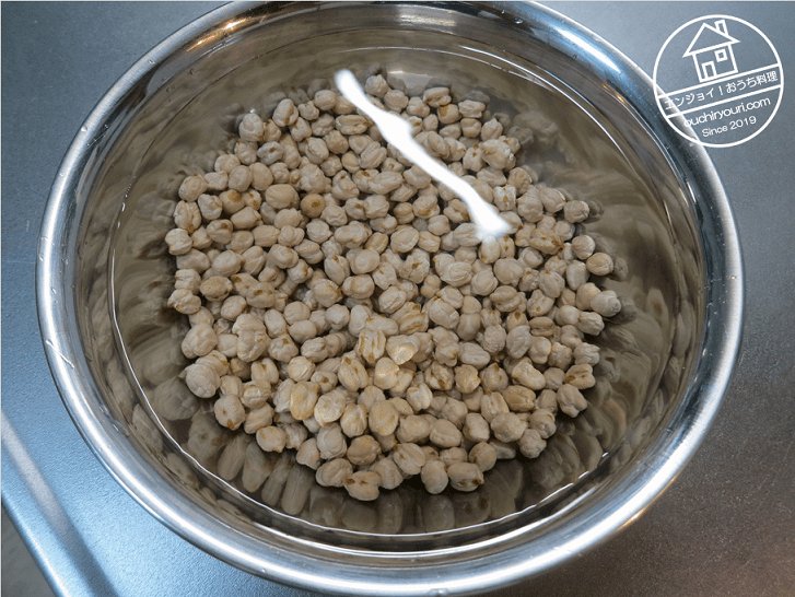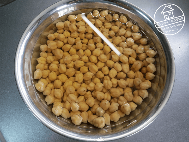 こちらは乾燥ひよこ豆333gです。1kg袋の1/3を使うことにしました。変わった形をしていますね。
