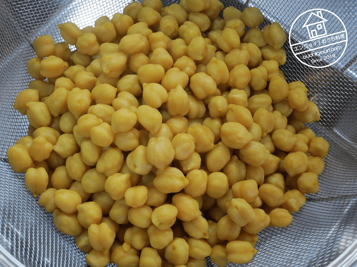 ネットで仕入れた情報を基に、ターメリックとローリエを入れた湯でひよこ豆を40分茹でました。ターメリックで豆が黄色く染まり本当にひよこそっくりになりました。ピヨピヨと鳴き声が聞こえてきそうです。ターメリックを入れるのはこれが目的だったんですね。ちょっとした遊びだったようです。