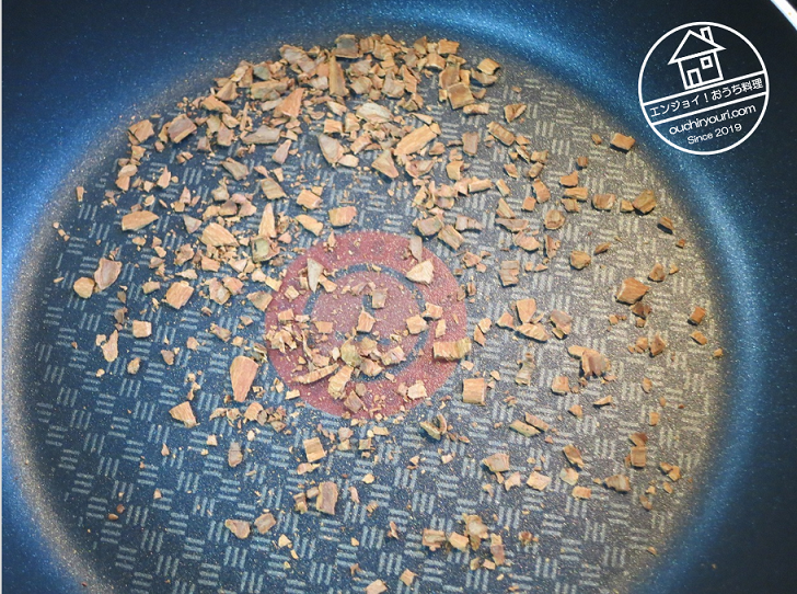 カレーのスパイスを準備します。こちらは細かく切ったシナモンです。シナモンはハサミで細かく刻んで混ぜ込んでしまう方がお勧めです。煮れば柔らかくなりますし、噛んだ瞬間に香りが弾けるからです。