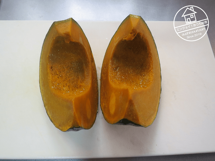 生かぼちゃは固すぎて、そのまま切るのは危険なので、レンチンします。