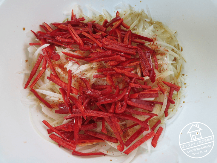 魚に下味をつけている間に、野菜を準備します。新玉と赤ピーマンは繊維に沿って細かく切ります。寿司酢、醤油、唐辛子で調味し、こちらも暫くおいて味を馴染ませます。浸透圧で野菜から水分が出ますが、この水分は南蛮漬けに必要なものなので捨てません。