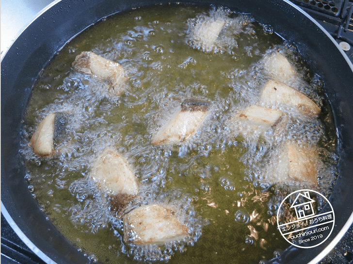 170-180℃に熱した油で魚を揚げます。具を入れた瞬間に油の温度が下がりますが、だからといってそこで火を強くし過ぎると今度は逆に油の温度が上がりすぎて具が焦げたり、油が劣化したりしますので、やりすぎないようにしましょう。どうも180℃を超えると油の劣化が急速に進むようです。温度計を使いながら感覚を身に着けるのが良いと思います。