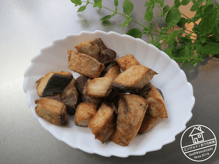 ハマチは先ず水洗いして血を流し、水気をふき取ります。ピンセットで骨を抜き一口大に切ります。塩、酒をふって、暫くおき、臭み消しと下味付けを行います。