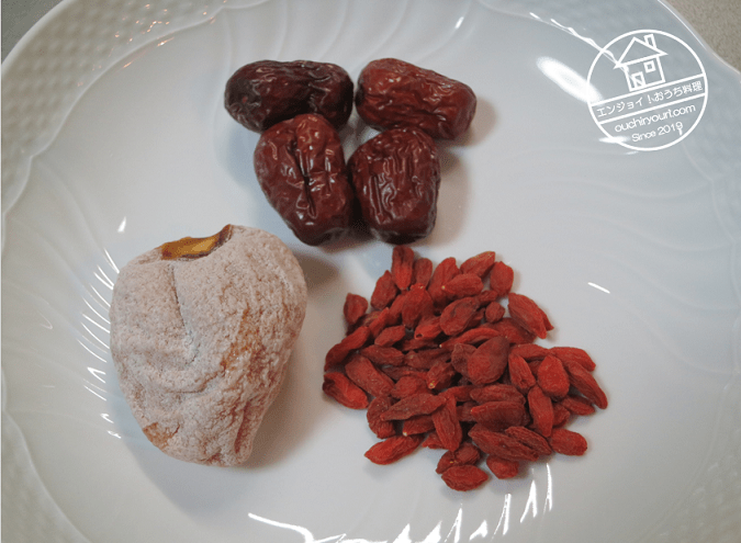 そういえば甘み要素を入れてなかったなと思ったので、ドライフルーツを入れました。干しナツメ、干しクコ、干し柿です。普通干し柿は入れないと思いますが、合いそうに思ったので。